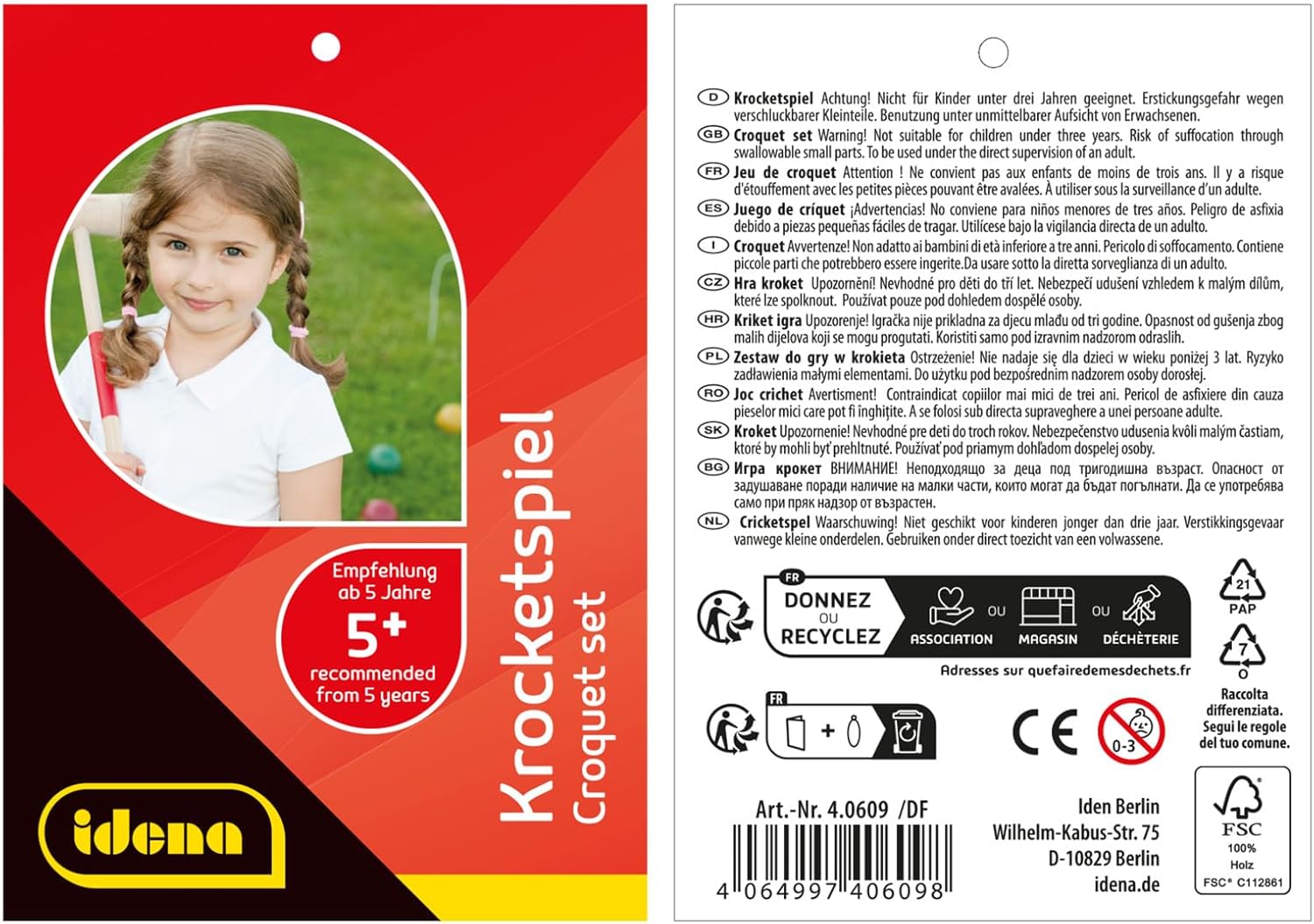 Highest concentration, a targeted, well-dosed stroke and an attentive tracking of the movement of the ball - the croquet game has been inspiring young and old since the 16th century. It is played in the open air on lawn or a meadow. For game preparation, a course with the U-shaped goals is staked and the starting and finish point is marked with a stake. Alternately, players hit their colour-coded ball in such a way that it passes the goals one after the other in the specified order. Whoever touches the target post with their ball first wins. Included are 4 rackets (length approx. 52 cm), 4 balls colour-coordinated to the rackets, 6 goals, 2 marking rods and a practical net for storing and transporting the game. The croquet game from Idena is made from sturdy, mostly natural and sustainable FSC wood and suitable for 2 to 4 players.