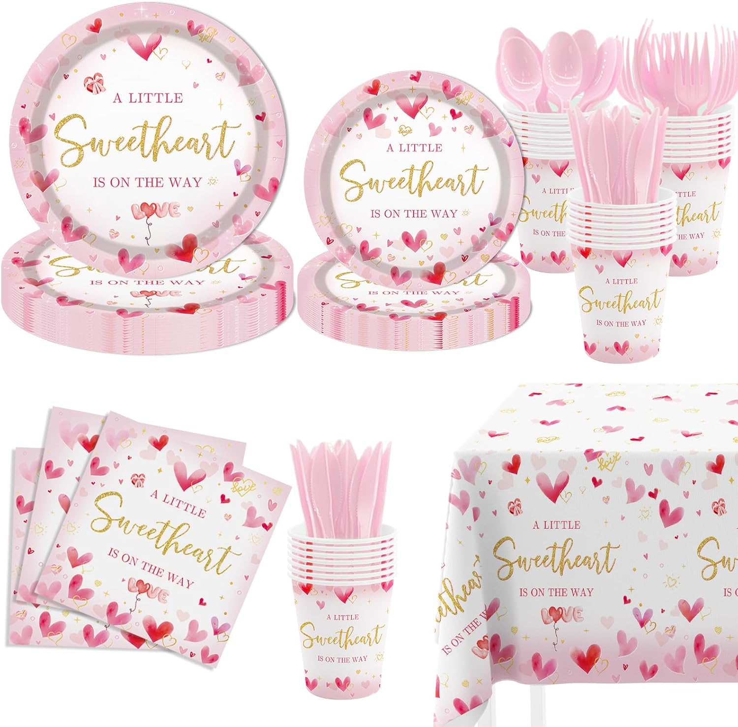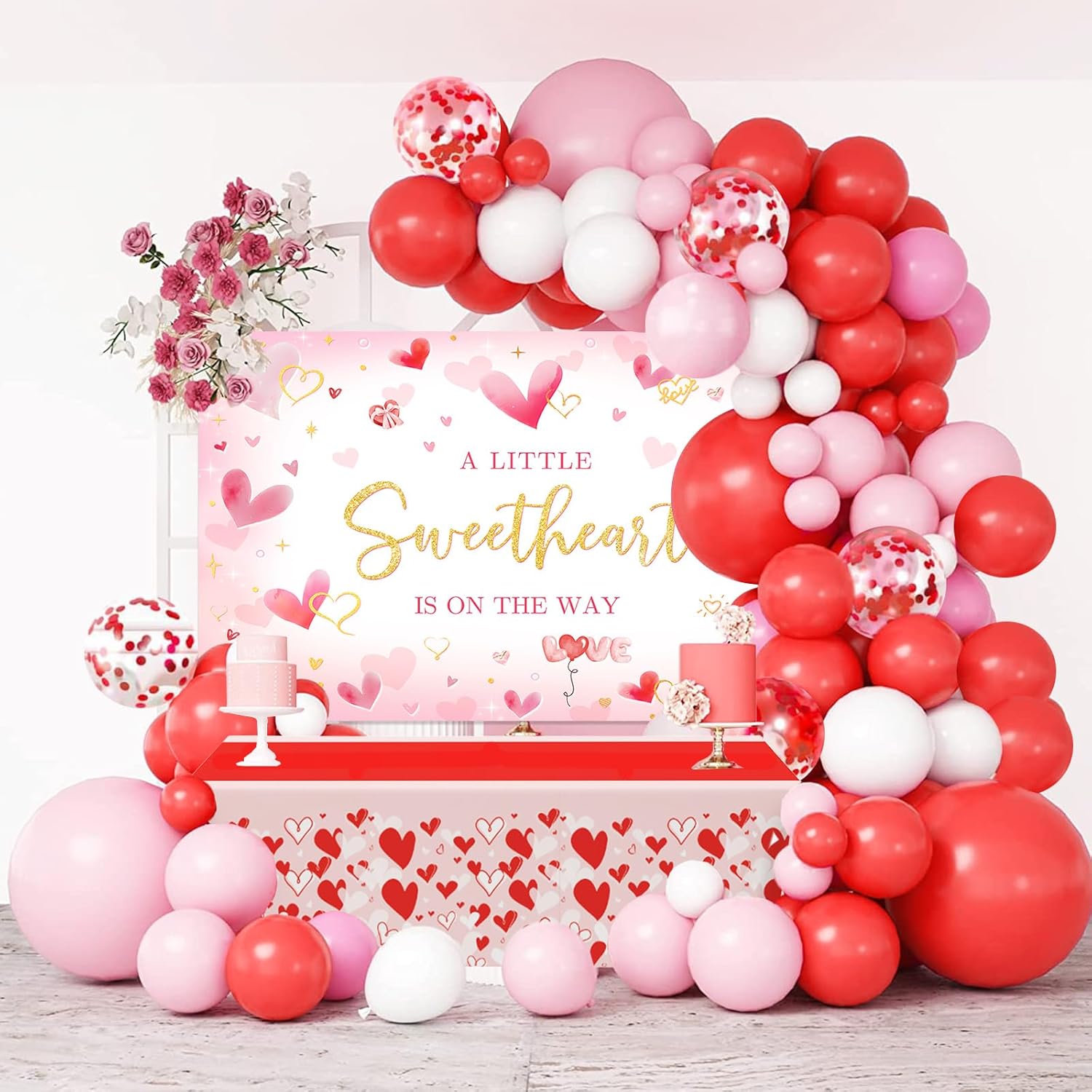 MEHOFOND Valentine's Day Baby Shower Decorations, A Little Sweetheart is On The Way Party Supplies Pink Heart Disposable Tableware Set 169Pcs Plates Napkins Plastic Tablecloth for Baby Shower Party MEHOFOND Valentine's Day Baby Shower Decorations, Pink Sweetheart Balloons Garland Arch Kit, Valentines Love Baby Shower Party Supplies 174Pcs with Baby Girl Shower Backdrop and Heart Table Cloth